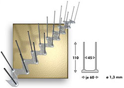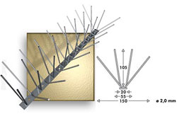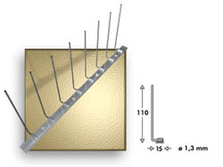 Die Edelstahlstangen mit einem Durchmesser von 2,0 mm werden von ca. 31 mm hohen UV-stabilisierten Kunststoffhöckern aufgenommen, die mit einem Spezial-Kleber verklebt werden. Das System ist ca. 25 mm breit und verhindert auf einer Breite von max. 100 mm das Absitzen der Tauben.
