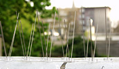 Das System »Spike Duo« dient dem Schutz von Gesimsen, Fensterbänken und anderen waagerechten Flächen. Senkrechte Spikes aus rostfreiem Federstahldraht sind auf einer gleichmäßig geschwungenen Schiene aus Polystyrol befestigt. Diese Kunstoffschiene ist absolut witterungsbeständig und aufgrund ihrer Transparenz vom Untergrund kaum zu unterscheiden.
